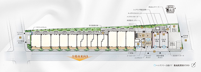 東西に長い敷地形状と戸建てエリアが広がる立地を活かし、全邸南東向きに。