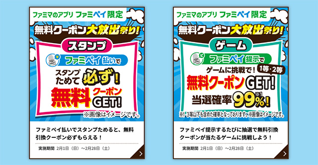 ファミリーマートは2月28日までの1か月間、2月限定でファミマのアプリ「ファミペイ」お得まつりを2本立てで開催!