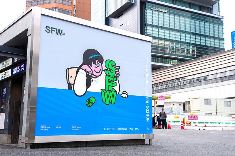 会話が生まれ、価値観が交差し、来場者も加わって“関係を育てる場”をめざす SFW 渋谷ファッションウィーク2026春(3/13~3/22)は、Face Oka が描き下ろした期間限定のアートが「THE CITY DRESSING」として渋谷の街を彩り、来街者をお出迎え。