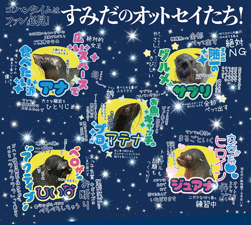 すみだ水族館に暮らすオットセイ5頭のゴハンタイムの特徴を性格などとあわせてパネルで紹介。