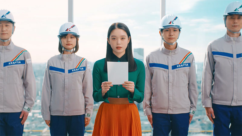 カメラがゆっくりと高石に向かって寄っていく短い時間のなかでも、クラフティアの社名変更への想いや、未来を切り拓く強い意志を演技に乗せて、最後にひと言、“決めぜりふ”。