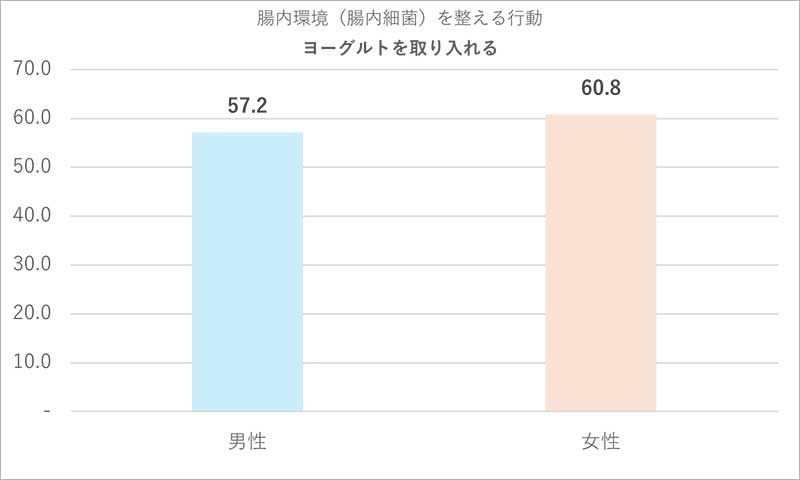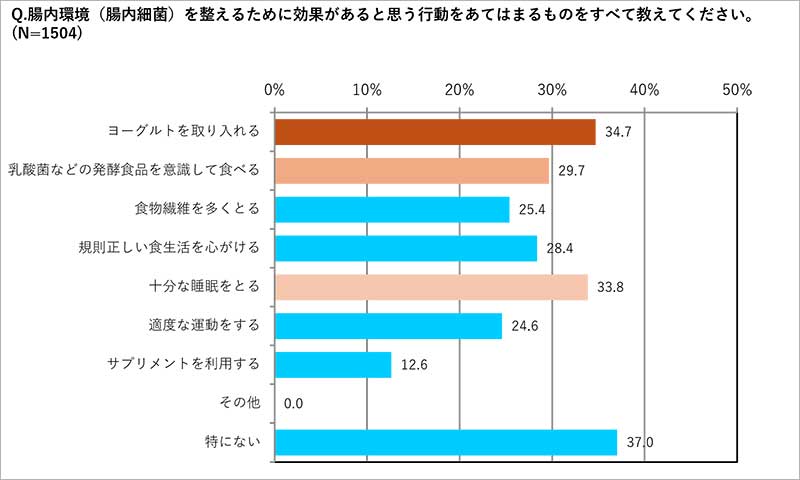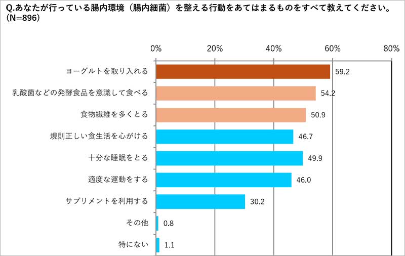 ◆腸活を実践している人の対策は「1位:ヨーグルト(59.2%)」、「2位:乳酸菌などの発酵食品(54.2%)」、「3位:食物繊維(50.9%)」