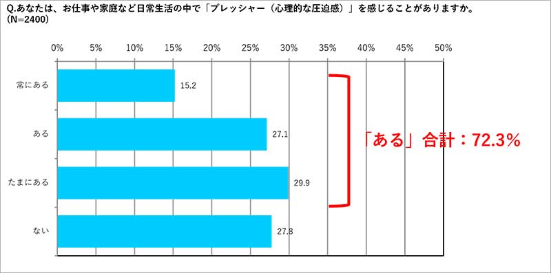 ◆日常生活でストレスを感じている人は82.3%、プレッシャーを感じている人は72.3%。