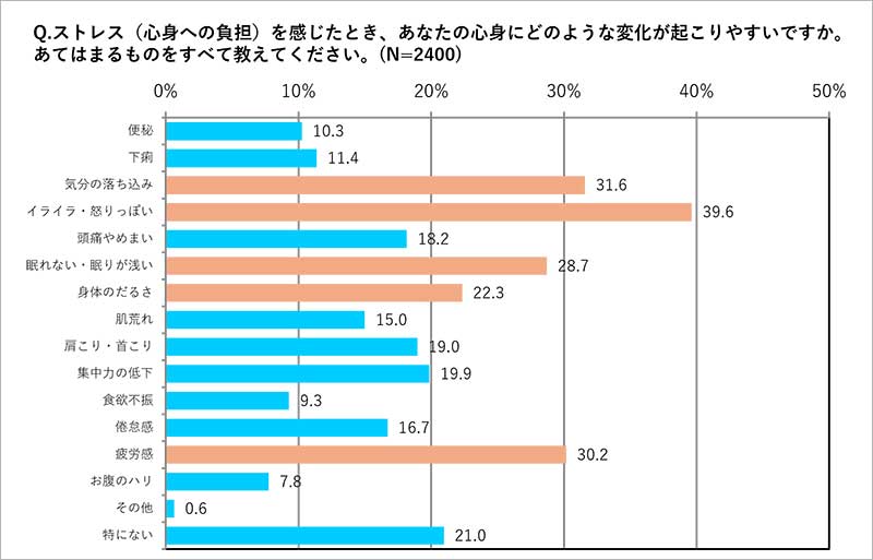 ◆ストレスを感じることによる心身への影響(変化)については、「1位:イライラ・怒りっぽくなる(39.6%)」「2位:気分の落ち込み(31.6%)」「3位:疲労感(30.2%)」「4位:睡眠障害(28.7%)」「5位:身体のだるさ(22.3%)」がランクイン。