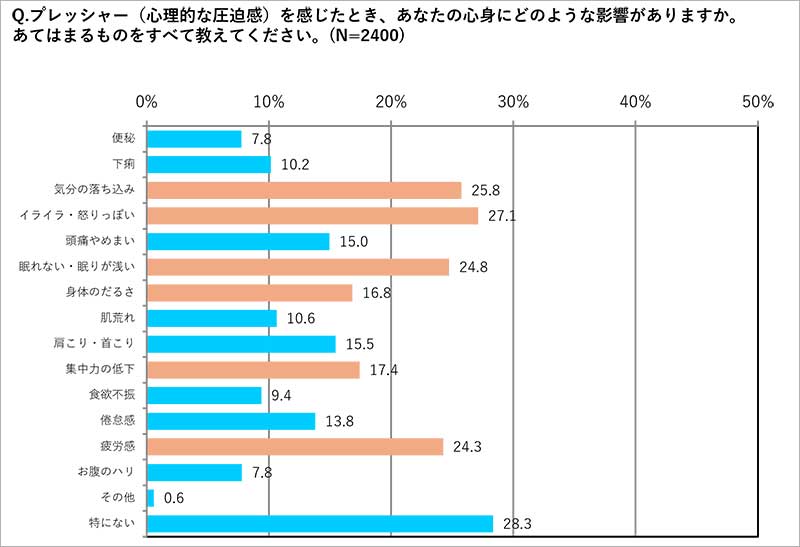 ◆プレッシャーを感じることによる心身への影響(変化)については、「1位:イライラ・怒りっぽくなる(27.1%)」「2位:気分の落ち込み(25.8%)」「3位:睡眠障害(24.8%)」「4位:疲労感(24.3%)」「5位:集中力の低下(17.4%)」がランクイン。