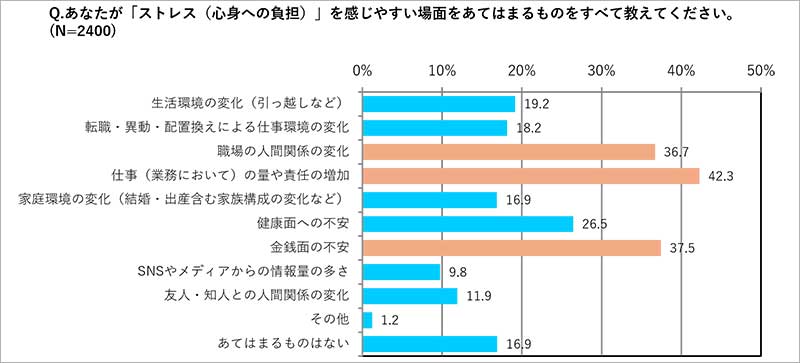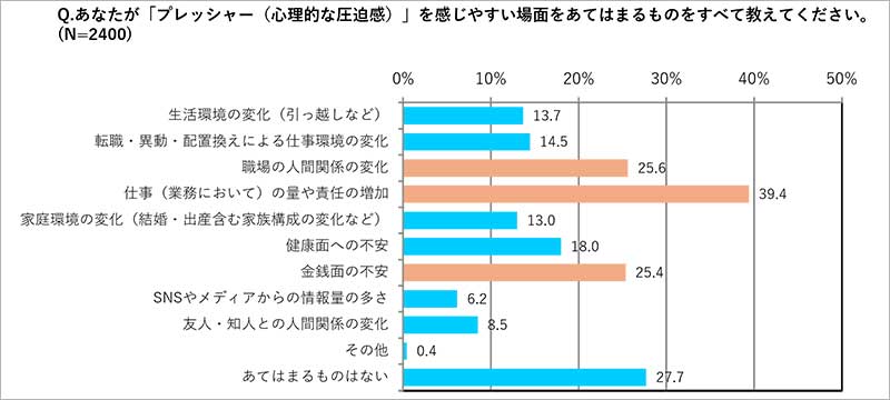◆ストレスを感じる場面としては「仕事(業務)の量や責任の増加(42.3%)」が最も多く、同様にプレッシャーも「仕事(業務)の量や責任の増加(39.4%)」がトップに。